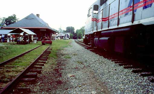 CHAPTER_TRIP_ROARING_SPRING_7-28-2002-A.jpg (43861 bytes) Photo is of Chapter trip approaching Roaring Spring PA station on Sunday, July 28, 2002.  This was Roaring Springs "Spring Dam Weekend".  At left of scene is antique auto show.  Photo by David Seidel