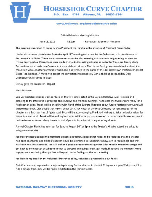 Al Novotny will be bringing the 104 to Duncansville so Floyd can start on the vestibules and other work can also proceed. There has been no requests for information or sale of the Duquesene. Dick reported the waiting list is up to 23 for the Western Maryland trip. He can get a mini bus for the extra people and sees no problem getting the extra tickets. Dick also wanted to make a motion that the profit from this trip go toward some type of jacket for Chapter members, so that when we have an event we all look uniform and are noticeable. This motion was seconded by Joey and the motion carried. Jeff showed those present a jacket he purchased from New Look in the price range of $60.00 with logo. He also suggested that if necessary members could do a 50/50 split on the cost. Frank asked Joey and Joe Harella if they possibly knew what happened to the April 2011 minutes. He does not have a copy and was not present at this meeting. Dick and Tom have looked over the Union League and will be putting a committee together to decide what work needs done. Nick reported on his Railroad Club they will be touring the museum on May 10th and Joey will be their tour guide. Motion to adjourn was made by Joey and seconded by Dick. Meeting adjourned.