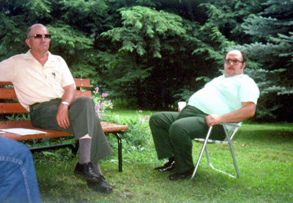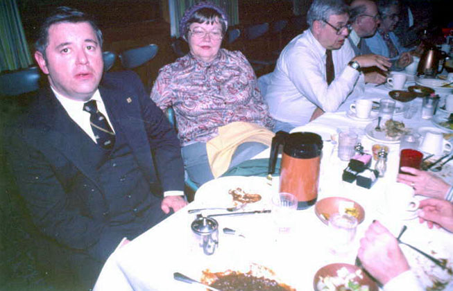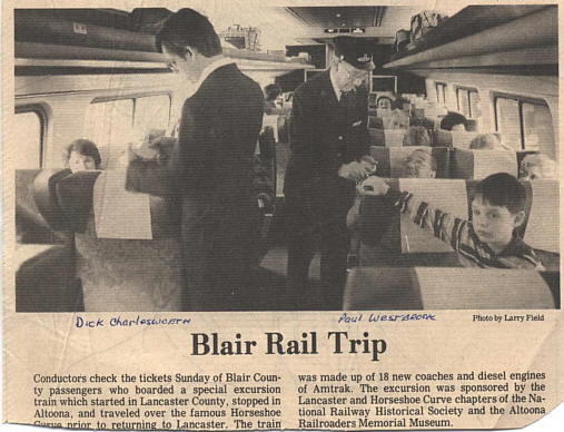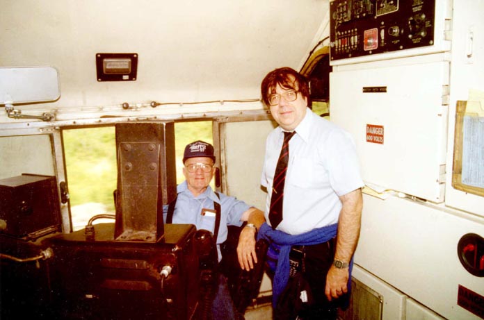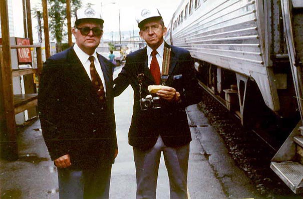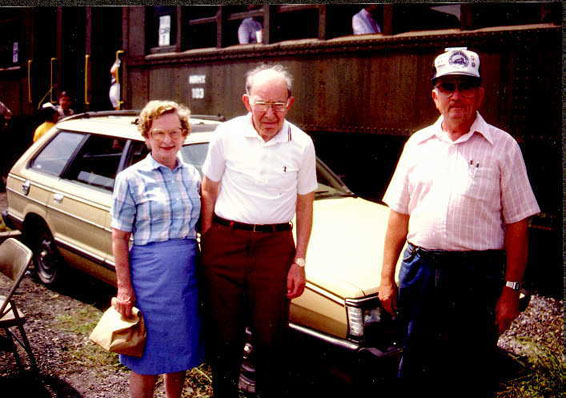 August 1986. Horseshoe Curve Chapter NRHS is operating a train excursion on the Everett Railroad, from Claysburg, Pa., with former Erie-Lackawanna commuter coaches purchased during the preceding year. Left to right: Edna and Paul W. Westbrook Jr (Past President of Horseshoe Curve Chapter with a tenure exceeding ten years), and Roy Hunt. Mr. Westbrook and Mr. Hunt are now deceased. Photo by David Seidel | ||