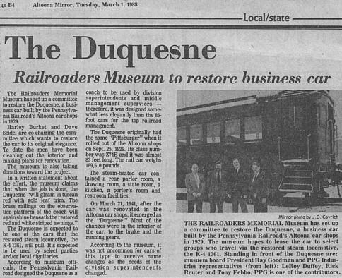 "The Duquesne, Railroaders Museum to Restore Business Car";