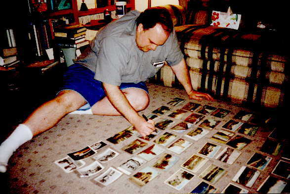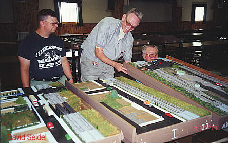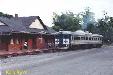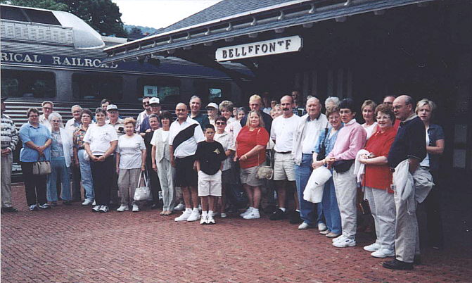 ANDY MULHOLLEN 5-99 NRHS BOOK LAYOUT.jpg (42379 bytes) A photo of Andy Mulhollen during the selection and layout phase of preparing the Altoona postcard book. This evening, Andy and David Seidel were doing a final selection of the postcards to be used.  05-1999 (photo by David Seidel) Father's Day trip to Bellefonte, PA (6-20-99). The Chapter rode the Bellefonte Historical RR's RDC cars from Tyrone to Bellefonte, PA. Dinner was served at the Bush House and members (and guests) rode the train back to Tyrone.