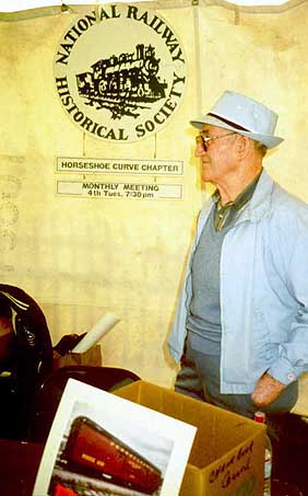 Photo of George Thompson exhibiting his extensive collection of O-gauge locomotives for the 30th Anniversary open house at the Eldolyn Terrace, Altoona; 5-16-98