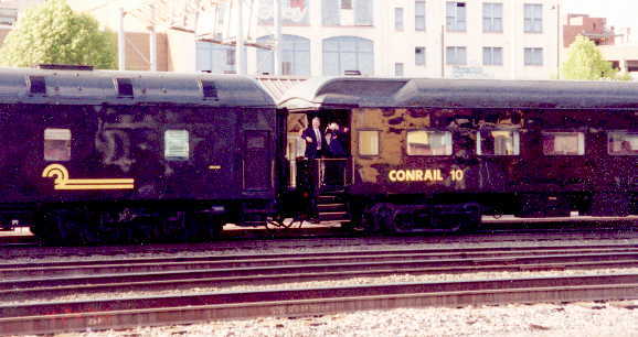Andy Mulhollen displays is collection of old PRR photographs and railroad memorabilia at the Eldolyn Terrace, Altoona; 5-16-98 4-24-98 G PRICE & L MC KEE.jpg (30616 bytes)  Photo taken April 24, 1998 at Altoona Station. Conrail Office Car special with Gary Price and Larry McKee on the deck between cars. Special operated in conjunction with Grand Opening of Master Mechanic Building, Altoona Railroaders Memorial Museum.  Photo by David Seidel.