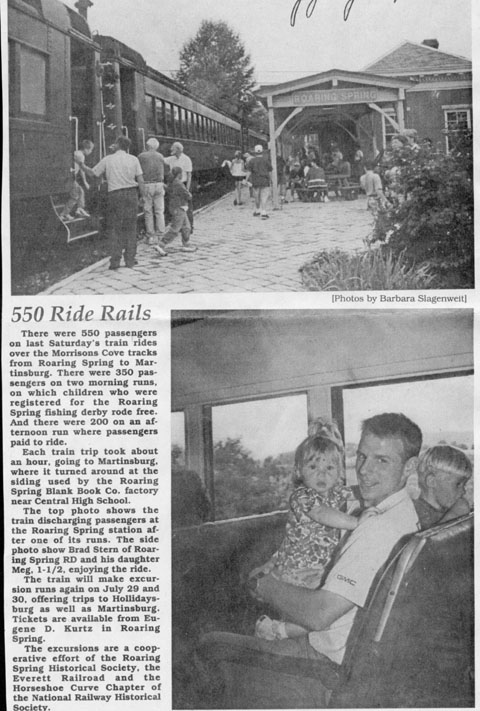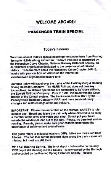 Sat, 12 Aug 2000 Update "All the trains on the August weekend sold out totally. We had to turn some people away. No problems were reported. The September 23 railfan trip is selling well and there is a photo run-by planned. Mr. Maples placed his private car and the Everett RR caboose in the consist. He allowed Chapter members on board during the noon run. They even provided food and drinks for us. We must thank him as he has been a wonderful host for these excursions. He had employees of his on the car at 9am and his friends at 3 pm. All in all, a wonderful weekend which we hope to repeat in September and October. Thats all for now. Photos to follow." Andy Mulhollen (posted 8/24/00) July 29, 2000 Update "The Chapter's first train excursion , I understand, was a complete success. The morning was a charter, and the 1:00 PM train had 192 passengers. I understand Channel 10 (WTAJ; CBS affiliate) had some film footage but I didn't see it. The cars are on a siding at Roaring Spring." David Seidel (posted 8/24/00) |