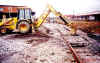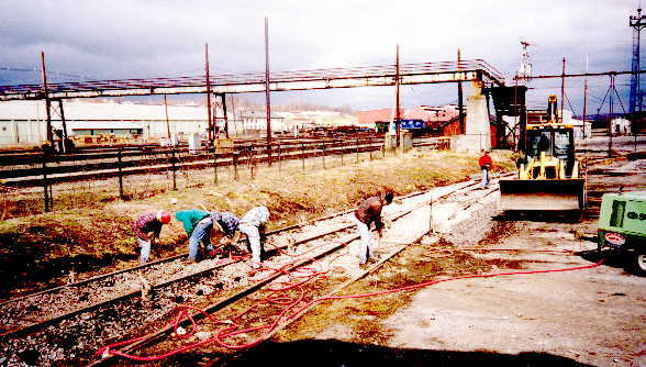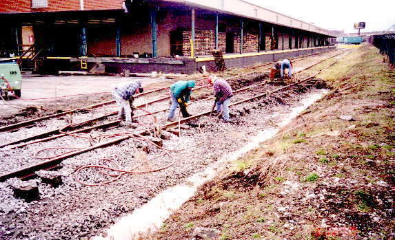 All in all, this was a very nice trip as well as being a fund-raising opportunity. Hopefully, we may have gained a few new members as well. As I stated in the March 3, update, additional repeat trips were planned due to the volume of interest. Additionally, Bill Mangiacarne reported that with the anticipated addition of the Amtrak train, the "Manhattan Limited", he hopes to be able to plan day-trips to Pittsburgh as well as weekend trips to New York City. March Chapter (business) Meeting - March 28, 2000 Jan Finkbiner and Associates worked and completed the siding March 11, 12, 13, and 14. His estimate was a little higher than the Everett Railroad. The switch was installed and the siding was repaired. Keystone Restoration contributed tmoney toward the work. Frank Givler will be contacting Ed Strong (Union Tank Car Company) regarding having a sample of the insulation from the Duquesne tested. Frank also contacted Larry Jackle and Bob Robison. They reported that CSX RR has inspected the cars and needs to know the final destination. Frank told Bob to ship them directly to the Everett Railroad if the cost was going to be the same as being shipped to Altoona. Frank is going to Kingwood to inspect the cars before they are shipped back. The cost of any damages to the cars will be taken care of by Kingwood. Cheryl Smith (ARMM) sent a letter to the Chapter concerning contributing to the Heritage Scholarship Program. Frank initially declined due to the expense associated with the 4th Street siding project. After much discussion, a motion was made to contribute $150 again. It was voted to approve. As of 2-28-00, there have been 373 books (A Postcard History of Altoona) sold. They are for sale at the Blair County Visitor and Convention Welcome Center (Logan Valley Mall) and at the Gift Shop at the Museum. Gene Kurtz from the Roaring Spring Historical Society has contacted us and the Everett Railroad to do some tentative plans for Excursions this summer. The Historical Society does a fishing day for the kids at the dam in Roaring Spring and would like to include a train ride. Contacts have been made regarding insurance and with Alan Maples regarding the cost of the train and crew. If all goes well, we will be running trips with Roaring Spring and on our own. We hope to run from Roaring Spring to Martinsburg and from Roaring Spring to Hollidaysburg. Alan suggested storing the coaches at Claysburg or at the siding at Blank Book. Plans are still developing and nothing is yet finalized. The jackets that Richard Vinglass worked to put together are on hold due to the higher than anticipated cost of initial screening. Ward Siding Update - March 31, 2000 As mentioned previously, The Horseshoe Curve Chapter, NRHS, and the Keystone Restoration and Preservation Society, in an agreement with the Ward Company, Inc, installed a new switch at the Ward Company siding at 4th Street, Altoona. There have always been two sidings next to the Ward Company's building, however, the switch was removed years ago. Taken on 3-12-00, these photographs show the completion of the installation of the new switch as well as ballast and tie replacement. Some drainage improvements still need to be made. The Chapter's MU coaches, other rolling stock, as well as the KRPS's rolling stock will be stored on the siding next to the mainline. The siding next to the building is reserved for use by the Ward Company. As you can see, the property is fenced in. For those unfamiliar with the area, the Fourth Street Pedestrian Bridge (now closed) is shown here in the background. The photographs are by David Seidel.