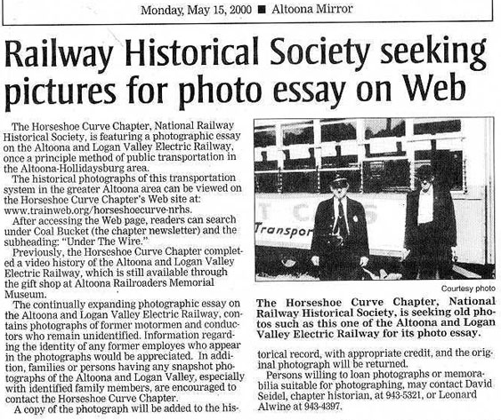 | In the process of working on the Under the Wire section of this website, a request for photos was printed in the 5-15-00, Altoona Mirror. | ![]() |