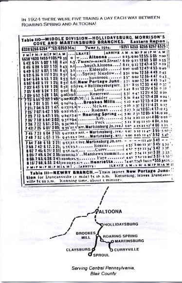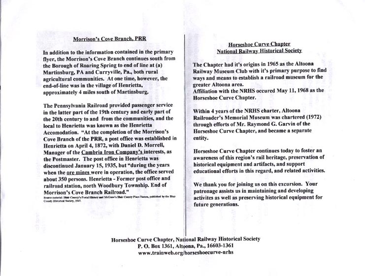 September 19, 2000 Business Meeting Most comments focused on preparations for the excursion this Saturday, September 23...which is sold out, mostly to railfans. Anyone working should report one hour ahead at 9 AM (some of us are meeting for breakfast at 8 AM at the Spring House restaurant n Roaring Spring). Discussed were precautions, staffing, and particular detail to safety issues and, photo runby locations (Monastery Road - quasi/public; private lawn/pond). Monastery will be on Northbound run, pond on southbound run. Blair Twp was notified in case they want to monitor the crossing. Railpace magazine will be covering trip in the AM. with a PM. stop at the East Broad Top RR. It was suggested that staff persons have cotton gloves and small prybars for opening windows. Snacks will be distributed to passengers aboard at no extra cost. The first run from Roaring Spring will be to Martinsburg and return; a magician (for on-board amusement) will be picked up at Roaring Spring, and then the train will proceed to Hollidaysburg and return. Uniform of the day: Black or Blue trousers, white shirt. All else optional. Name tags being prepared. The window procedure was reviewed . David Seidel will modify the handout flyer for the trip. The next Chapter sponsored train excursions are Oct 14 & 15 from Roaring Spring. Ads were placed in the Morrison's Cove Herald and Shopper's Guide. David Seidel announced the "Westsylvania" magazine photo essay (which he contributed to), which will be supplemented by a slide presentation on Tuesday evening, Oct 3, 7 PM at the Southern Alleghenies Museum of Art, Altoona. The event is open to the public. The September/November issue of "Westsylvania" magazine, a bi-monthly publication dealing with the history and beauty of western Pennsylvania, contains a 7 page photo-essay utilizing photographs of Horseshoe Curve Chapter Historian, Dave Seidel. Entitled "Autumn On The Mainline", the photographs were taken during September/October 1999 along the railroad mainline between Horseshoe Curve and Conemaugh, Pa. highlighting the annual autumn foliage. Text by Dave Hurst of the "Westsylvania" staff. (Dave Seidel, 9/3/00) Discussion was held on assists by Chapter members at Railfest for Altoona Railroaders Memorial Museum for Oct 7 & 8th; to include the Chapter tent (offered by Robert Hunt at no charge) to sell the "Greetings from Altoona" postcard book and the video tape on the Altoona & Logan Valley Electric Railway history. Discussion also debated on whether or not to have a dinner/social meeting for October. It was suggested a regular meeting should take place since nomination of officers is due. Plan for a dinner meeting around the first Friday in December for the Christmas event replacing the meeting for that month. David Seidel also announced Logan House dinner. See separate report on that. (David Seidel; 9-20-00)