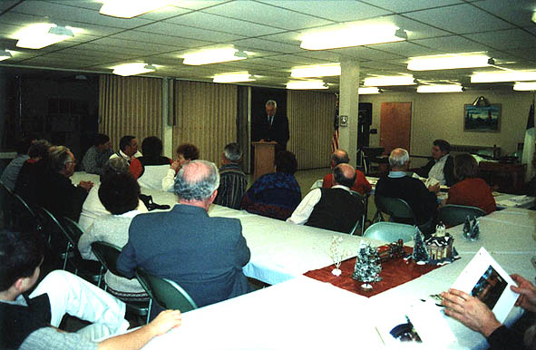 Present as Guest Speakers were Bob Ridenour (Vice President of the Bloody Run Historical Society) and Ed Albiker (curator of the Society's museum). They gave a presentation on the history of the town formerly known as Bloody Run (later renamed Waynesboro and then Everett) and the Huntingdon Broad Top (later renamed the Everett) Railroad. Ridenour said that they purchased Everett's RR Station and Freight Building for $9000 several years ago (It had been slated to be burned for local firefighter training) and had it moved to its present location by Earl Miller House Movers. The station took 10 years to restore. It is the only remaining station out of about 32 railroad stations used by the HBT in Bedford County. The Society also acquired former HBT locomotive #11. An amusement park (Williams Grove?) had purchased the Baldwin 2-6-2 from the HBT/Everett RR, had planned to operate it, transported it to the park under its own power, and dismantled it while performing repairs. Interest dwindled due to the repairs necessary and parts were either lost or stolen over the years (the Society is looking for a headlamp and back up lamp for the locomotive). The locomotive was transported back to Everett by Earl Miller (who also moved the Altoona Railroaders Memorial Museum cars the "Jack Narrows" and the "Harbor View" from Phillipsburg, PA). Plans are in the works for a cosmetic restoration of the locomotive as well as an Everett RR caboose. Several photographs of the caboose and locomotive were presented as well as an HO scale model of the #11 and three passenger cars (to be raffled off at the Society's open house on 12-10-00).