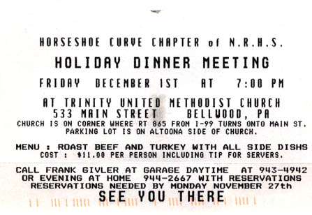 The Holiday Dinner Meeting was held on Friday, December 1st at 7pm at the Trinity United Methodist Church in Bellwood. An excellent dinner (which consisted of roasted turkey, roast beef, gravy, stuffing, homemade noodles, mashed potatoes, green been casserole, homemade rolls, pumpkin pie.
