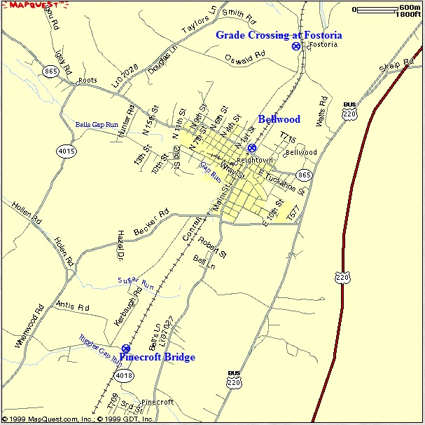 The east end tower ("BELL") was located at MP 230.0. Between 1955 and 1961, "BELL" became an unattended interlocking. Bellwood offers prime high and medium speed railroad operations along (and to the rear of businesses located along) Main Street. The first location is at the bridge at the intersection with Rt 865. Various other places located east and west from the bridge can also be accessed. Don't forget about the grade crossing at Fostoria.