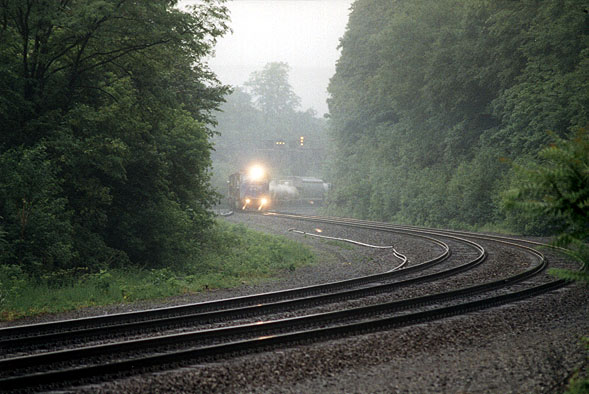 Looking South (RR East) at the private crossing off of Rt 453. A Westbound freight approaches Tyrone.  6/11/98