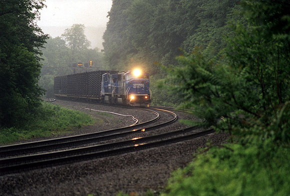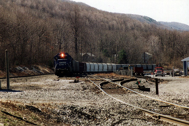 A Conrail local drops off loaded cars at the yard / interchange at Tyrone.  The Nittany Bald Eagle RR will pick up the cars for delivery.  Looking SW.  3/24/97