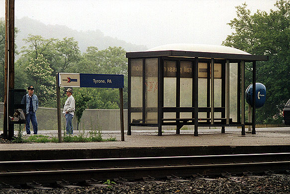 The former PRR Tyrone Station was demolished in the 1970's.  Its replacement was an Amtrak "bus shelter" (as seen below).  At the interchange, you will observe an Amtrak "bus shelter", which served as the "station" for several years.  Although Amtrak does not have scheduled stops here, passengers occasionally request to de-board at Tyrone.   A new transportation center (bus and train) was constructed during 2000
