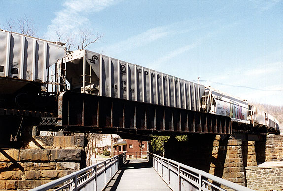 Located along Rt 453 to the East of Tyrone is a portion of a dismantled Railroad Bridge which had crossed over the road.  Underneath that bridge is a bridge which leads to a private grade crossing.  Opportunities exist for viewing the mainline operations on the interesting "S" curve.