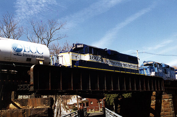 "December 10, 2007 — On the former Pennsylvania Bald Eagle Branch, now run by the N&BE. Two Lycoming Valley locomotives with a northbound freight slice through the middle of town"