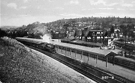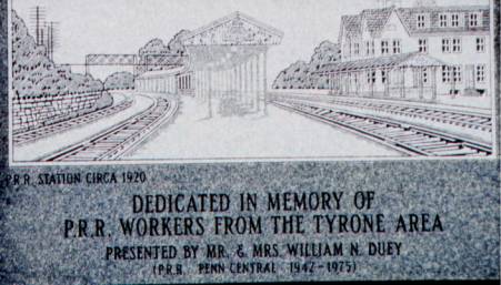 However, thanks to the generous contribution of Mr. and Mrs. William N. Duey, a granite memorial, designed and produced by Richard Stever of Mayes Memorials, has been installed on the boulder which is still the focal point in the park opposite Tyrone Station. This granite rectangle, thanks to modern computer technology, carries a carved scene depicting the 'old' Tyrone station with its station structures and four-track main line, circa 1920. The granite memorial reads: