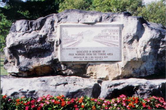 A recent addition at Tyrone Station Park is a memorial granite slab installed on a large boulder, memorializing the railroad workers of this community of Tyrone. During the steam era, when the original station stood, a brass plate Roll of Honor of Tyrone's veteran war dead graced this boulder, but was re-located to the Tyrone American Legion Post many years ago. The boulder was conspicuous with the rectangular space vacated by the veterans memorial, especially because of it's prominent position in the park setting of the Tyrone railroad station, even during the era post-Penn Central when the station structures were razed.