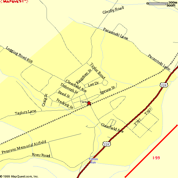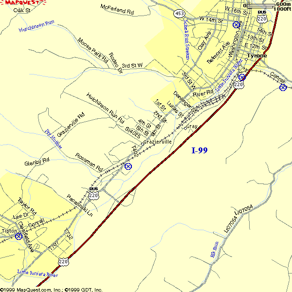 "....when the great Pennsylvania R. R. was projected and surveys were made to ascertain the most eligible route, the gap between the mountains where the Little Juniata cleaves its way through the ridges, changing its course abruptly from northwest to southwest, was recognized as the natural gateway between the populous East and the undeveloped West. At this point, midway between the capital of Pennsylvania and its western metropolis, being 117 miles by rail from Harrisburg and 131 miles from Pittsburg, was started and has grown up the embryo city of Tyrone....Situated near the center of the state, at the most northern point of the main line of the P.R.R., nature and the contrivances of men have united to make it a convenient distribution point for commerce. The coal fields of Clearfield and adjoining counties are reached by the T. & C.R.R. and through Bell's Gap by the Penn'a & N.W.R.R. The Bald Eagle Valley R.R. leads to the valley of the Susquehanna, connecting there with other lines of the P.R.R. extending to the Hard Coal region on the East and the Lake country in the North and West. The main line of this system gives access to the great cities of the Atlantic coast and to those of the middle states, being the highway of travel between New York and Chicago and St. Louis...Tyrone lies spread out before the eye, though not all of it can be seen from any one place. It stretches in an oblong shape, nearly north and south, along the river and creek, having an average width of about half a mile within the borough limits, reaching out toward the suburbs of Greensburg on the north, Northwood on the northeast, Nealmont on the southeast, and Thomastown and Grazierville on the southwest." ("Tyrone of To-Day, The Gateway of the Alleghenies" By Rev. W. H. Wilson, Tyrone, PA., Press of THE HERALD, 1897)
