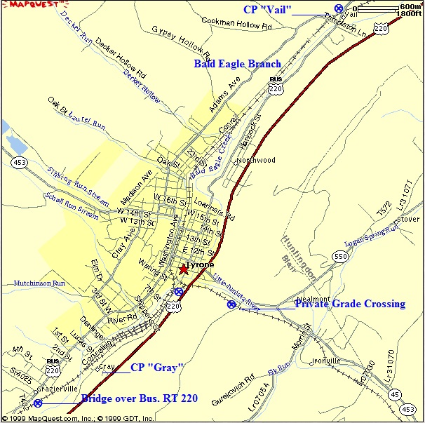 There is a detector at Tipton, Milepost 242.  Tyrone, PA marks the interchange for the Norfolk Southern (Conrail/PRR) mainline and the Nittany & Bald Eagle Railroad.  The Norfolk Southern (Conrail) main line follows the Little Juniata River to the Susquehanna River.