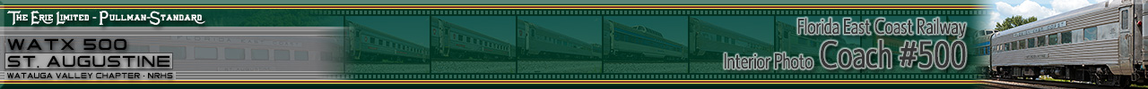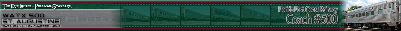 Built in 1954 by Pullman-Standard for the Florida East Coast Railroad and named "St. Augustine". Sold to the Seaboard Air Line Railroad in 1965. Conveyed to Amtrak in 1971 and numbered 5474 and retired in 1979. The car was sold by Amtrak in 1981 to a tourist railroad in Virginia. The Watauga Valley Chapter fo the National Railway Historical Society purchased the car in 1986 and completely restored the car to Amtrak standards and painted the car with a blue windowband and letterboards and named the car "Clinchfield". It was also assigned reporting marks "WATX 500". Restored to its original railroad and paint scheme in 2013, and renamed back ot its original "St. Augusitne" name by the Watauga Valley Railroad Historical Society and Museum. On a personal note: In 1991, I rode in this car on my very first mainline steam excursion behind Norfolk & Western 2-6-6-4 Locomotive #1218! Historical information about this car provided by The Watauga Valley Chapter - NRHS and Amtrak By The Numbers. |