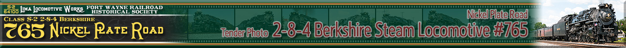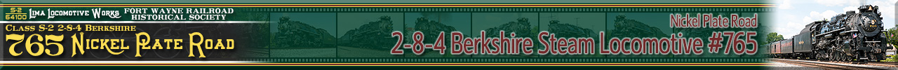 Built in September 1944 for the New York, Chicago & St. Louis Railroad (Nickel Plate Road) by the Lima Locomotive Works, #765 was one of 80 locomotives of this type built for the Nicke Plate, having operated in both freight and passenger service between Chicago, IL, Fort Wayne, IN and Bellevue, OH until June 1958. It's last service was the following winter, helping a stranded passenger train in Fort Wayne, which made it the last NKP Berkshire working on the railroad. #765 was so well-liked by crews and so dependable, the railroad stored it indoors until the early 1960's and was donated by the railroad to the City of Fort Wayne. For ceremonial purposes, she was renumbered 767 and placed on display at Lawton Park in Fort Wayne. The Fort Wayne Railroad Historical Society was formed to preserve and restore the locomotive which by 1972 had begun deteriorating. It was removed from the park in 1974 and by 1979 was operating again. It has been operating in excursion service ever since. In 2001, #765 underwent another rebuild costing $800,000 which was completed in 2005. Historical information about this locomotive provided by the Fort Wayne Railroad Historical Society. |
