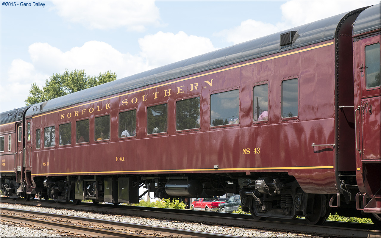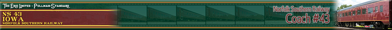 Built for the Chesapeake & Ohio Railroad by Pullman-Standard in 1950, the car was originally configured as a 52 seat coach. Later operated with the Allegheny County Port Authority. Later to the Connecticut Department of Transportation where the car was renumbered 1600, then onto the Adirondack Scenic Railroad where it was also numbered 1600. Acquired by Norfolk Southern in 2010 and overhauled in March 2014 to be handicap accessible, numbered 43 and named "Iowa". Historical information about this car provided by The Altoona Works and Jerry Laboda's Passenger Car Photo Index. |