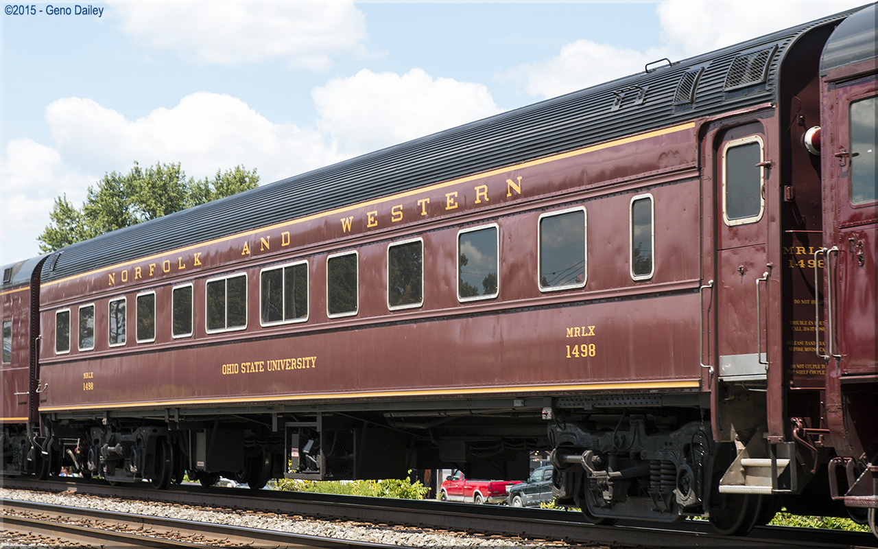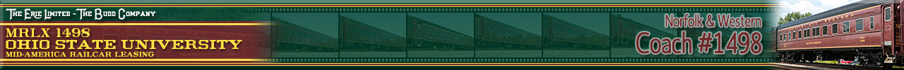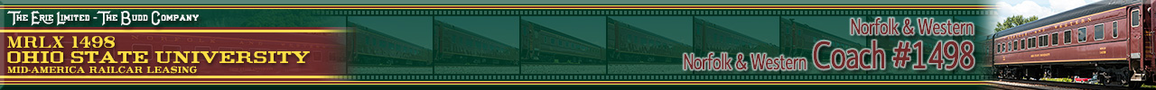 Built in 1948 for the Pennsylvania Railroad as a 10 Roomette-6 Double Bedroom Sleeper and numbered 1498. The car was later converted to a coach. Under Penn Central ownership, the car was renumbered 3240. Under Maryland Department Of Transportation ownership, the car was numbered 1414. Later operated by MARC and numbered 105. Eventually owned by the Southwest Georgia Railroad Excursion Authority and also numbered 105. The car was sold to the Tennessee Valley Railroad Museum in 2013. Most recently, it was acquired by Mid-America Railcar Leasing. Today, the car is lettered for Norfolk & Western and named "Ohio State University" and is numbered 1498 which is its original Pennyslvania Railroad number. Historical information about this car provided byJerry Laboda's Passenger Car Photo Index, Railway Preservation News, and Trainorders.com. |