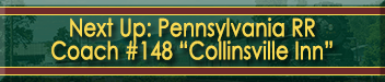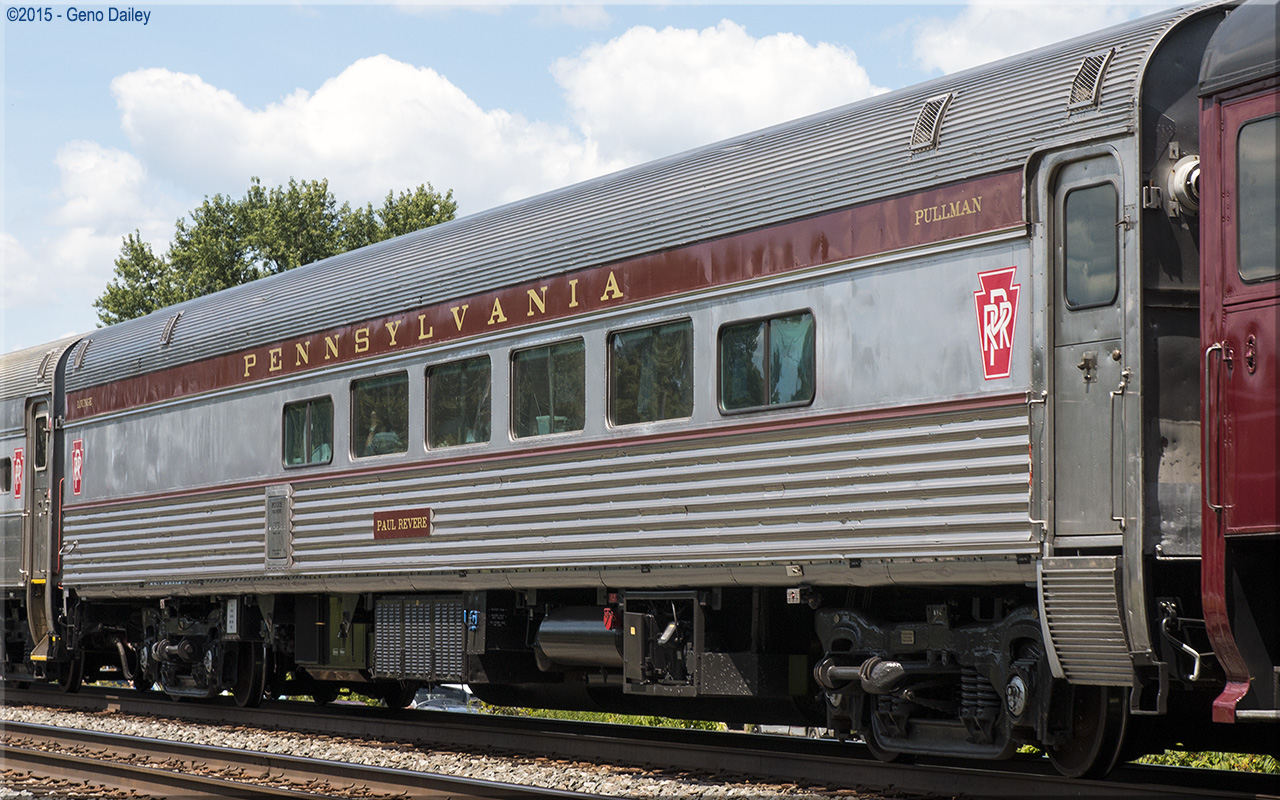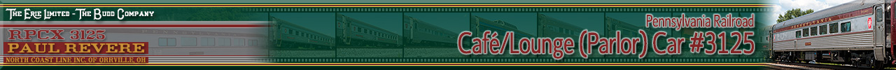 Built by Budd in 1951 for the Pennsylvania Railroad, numbered 7141, and named "Paul Revere". This car was used on the Pennsylvania's "Congressional" and "Senator" trains on the Northeast Corridor between Boston, New York and Washington, DC. Originally built as a Parlor Car with 29 seats and a 5 seat drawing room. To Penn Central ownership in 1968, the car was eventually conveyed to Amtrak and renumbered 3641, and operating still as a Parlor Car. Converted to a galley lounge in 1976 and renumbered 3327. From November 1976 to May 1977, the car was numbered 8367. Converted to Head-End Power from Steam Heat in August 1981 and renumbered 3125. Converted to a Cafe-Lounge car in 1989 and sold in 1995 into private ownership where it was used on the California Western Railroad where it became stranded in Willits, CA due to washouts on that line in 1998. Purchased in 2006 by Glenn Bowman, the car eventually made its way to Ohio and has since been rebuilt into a private Cafe-Lounge car lettered for the Pennsylvania Railroad and has kept its original name throughout its life. Aside from being a part of this excursion train, the Orrville Railroad Heritage Society has also used the car for its First Class accomodations on its own excursion trains. Historical information about this car provided by Amtrak By The Numbers and The Orrville Railroad Heritage Society & North Coast Line, Inc. |