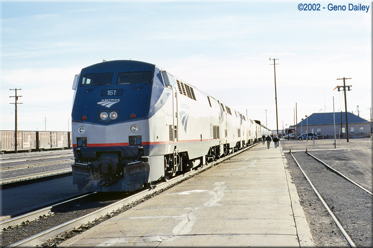 | Train #3 taking a break at La Junta, CO on February 22nd, 2002 with newly delivered P42DC #161 on the lead. |