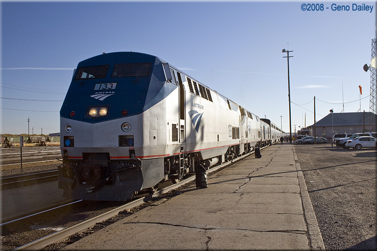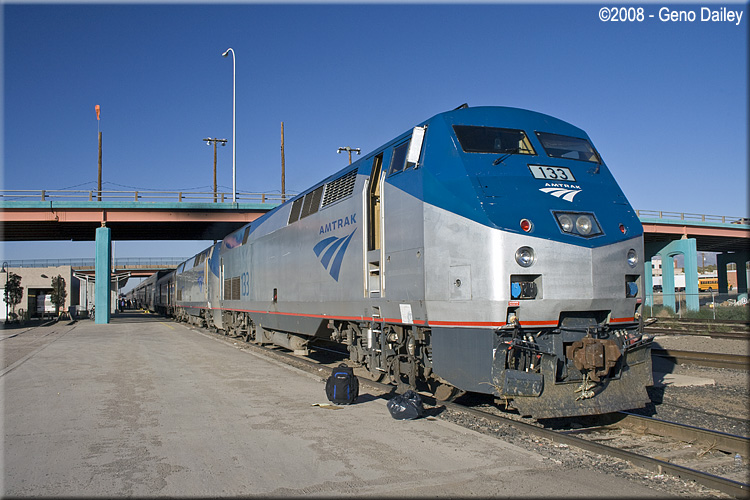 | Train #3 during its service stop at Albuquerque, NM on October 28th, 2008 with P42DC #133 on the lead. |