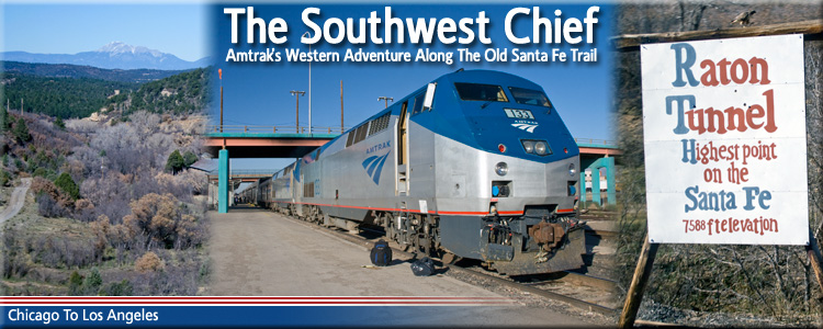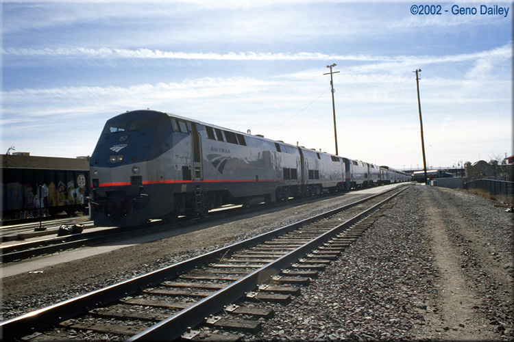 | Train #4 during its station stop/crew change point at Albuquerque, NM on February 27th, 2002 with P42DC #157 on point. |