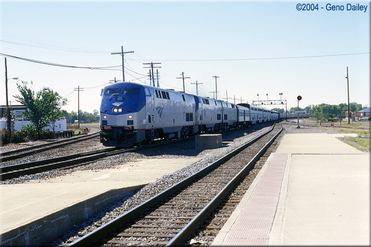 | Train #4 arriving at Galesburg, IL on September 28th, 2004. In a few hours, this train would arrive in Chicago and complete its 2000+ mile cross-country journey with P42DC #173 on the lead. |