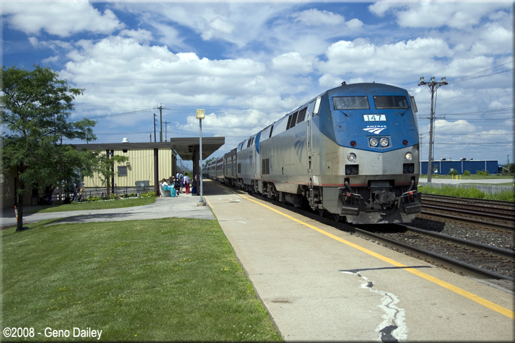 | Arriving at Buffalo-Depew Station on July 4th, 2008 at 11:46am is Train #48 with P42DC #147 leading. |