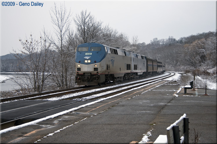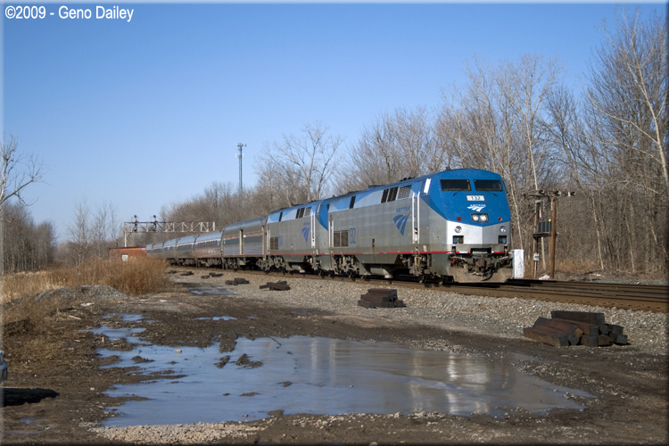 | Train #48 passing through North Chili, NY, west of Rochester at 10:38am on March 14th, 2009 with P42DC #132 leading. |