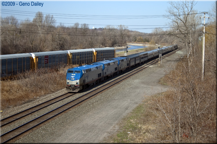 Train #48 flying through Amsterdam, NY along the Mohawk River/Erie Canal with