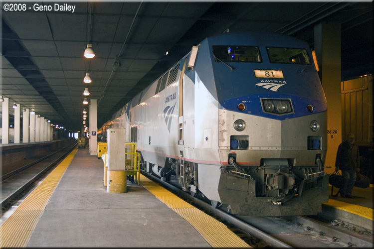 | Train #49 having just arrived at Chicago Union Station with P42DC #81 on the lead at 11:26am on October 27th, 2008. This location is technically not on the Water Level Route as Union Station is of Pennsylvania Railroad heritage but it is the western terminus of this train for which most of its route is on the famous former New York Central main. |