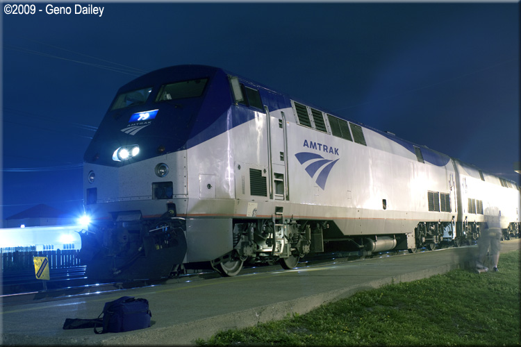 | Train #49 taking a break on July 4th, 2009 at 12:09am at Buffalo-Depew Station with P42DC #79 on the lead. |