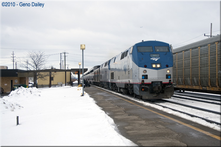 | Train #48 arriving at Buffalo-Depew Station on February 19th, 2010 with a full Superliner consist. It had this consist due to a freight derailment in Indiana which caused Amtrak to put this train set together so as to keep the train running that day. |