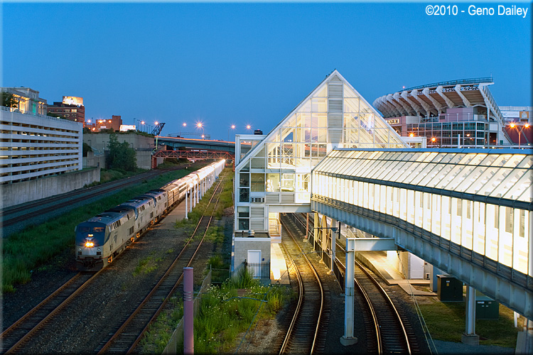 | Train #48 taking a break at Cleveland, OH just before sunrise on July 10th, 2010 with P42DC #207 on the head end. The 2nd track that passed by the station (would have been on the left side of the train) was torn up by CSX several years ago. This view was from the East 9th Street overpass with the local RTA station on the right with Cleveland Browns Stadium in the background. |
