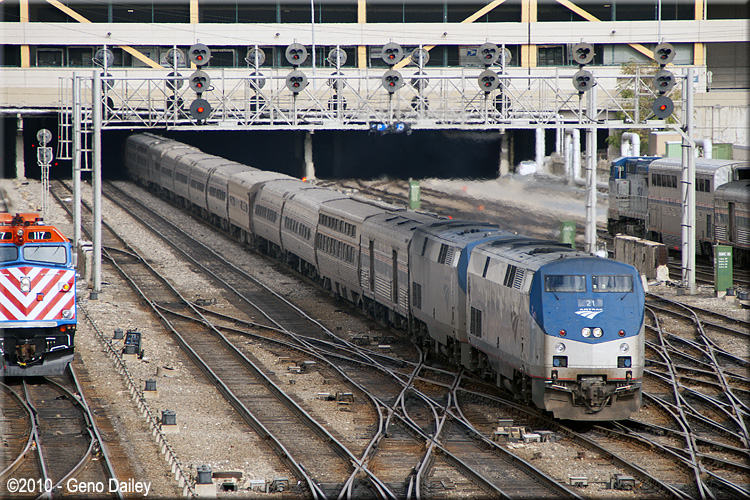 | Train #49 backing into Chicago Union Station with P42DC #21 on the lead on October 18th, 2010. This train was over an hour late when it arrived into Chicago. This view is from Roosevelt Avenue and was taken with an 18-200mm zoom lens. |