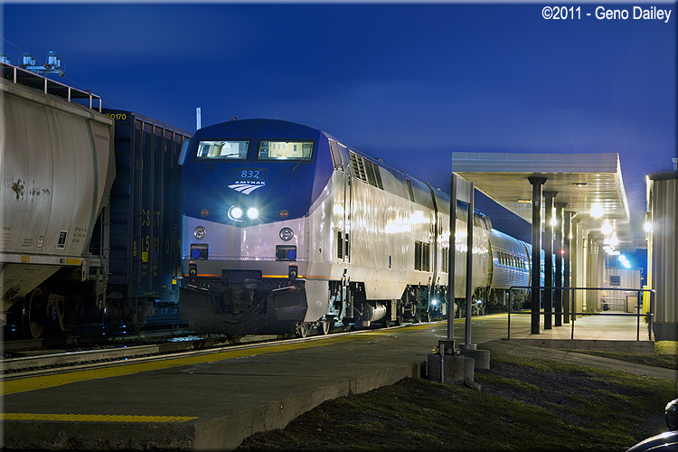 | Train #49 taking a break at Buffalo-Depew Station with P40DC #832 on the lead. 15 P40's were refurbished and placed back into service using American Recovery & Reinvestment Act (Economic Stimulus) funds. Tonight's train had #832 and #818 for power, something very rare today! The train was seen on Saturday, March 19th, 2011 at 12:53am. |