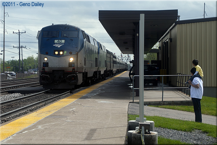 | Due to a bridge problem in Albany, Train #49 left Albany-Rensselaer Station significantly behind schedule. The end result was it arrived at Buffalo-Depew Station at 11:00am, running 11 hours and 5 minutes late. This is by far the latest I've ever seen this train at this station! Today's train had P42DC #40 ont the lead, seen on May 18th, 2011. |