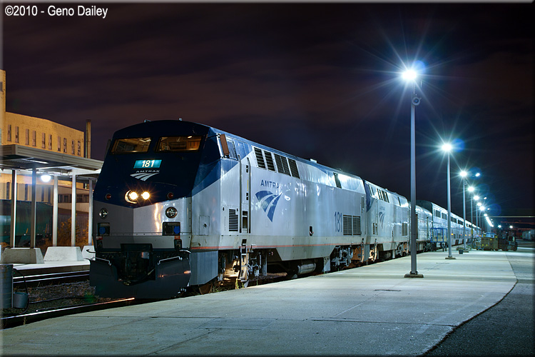 | Train #7/27 taking a break at St. Paul-Minneapolis Station with P42DC #181 on the lead on October 18th, 2010. |