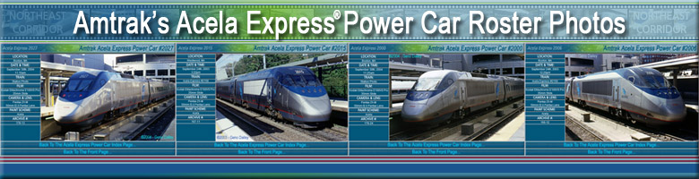 SPECS: 2 Power Cars are used each train, on each end, eliminating the need to wye the train to turn it around. These cars were built in 2000-2001 by a consortium headed by Bombardier and Alstom. All cars feature Amtrak's "Acela" paint scheme. |
