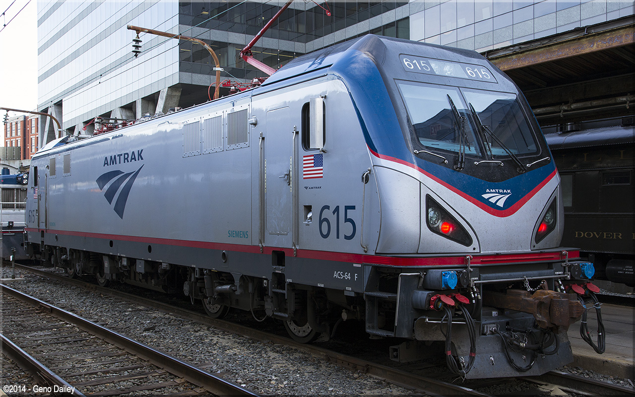 Built by Siemens Mobility in Sacramento, CA in June 2014 and numbered 615, these locomotives are the replacement for Amtrak's AEM-7 electric locomotives for use on the Northeast Corridor. The name "ACS-64" means "Amtrak Cities Sprinter" and the 64 represents 6.4 megawatts of electric power which is equivalent to 8600 horsepower. Historical information about this locomotive provided by www.amtrakbythenumbers.com. |