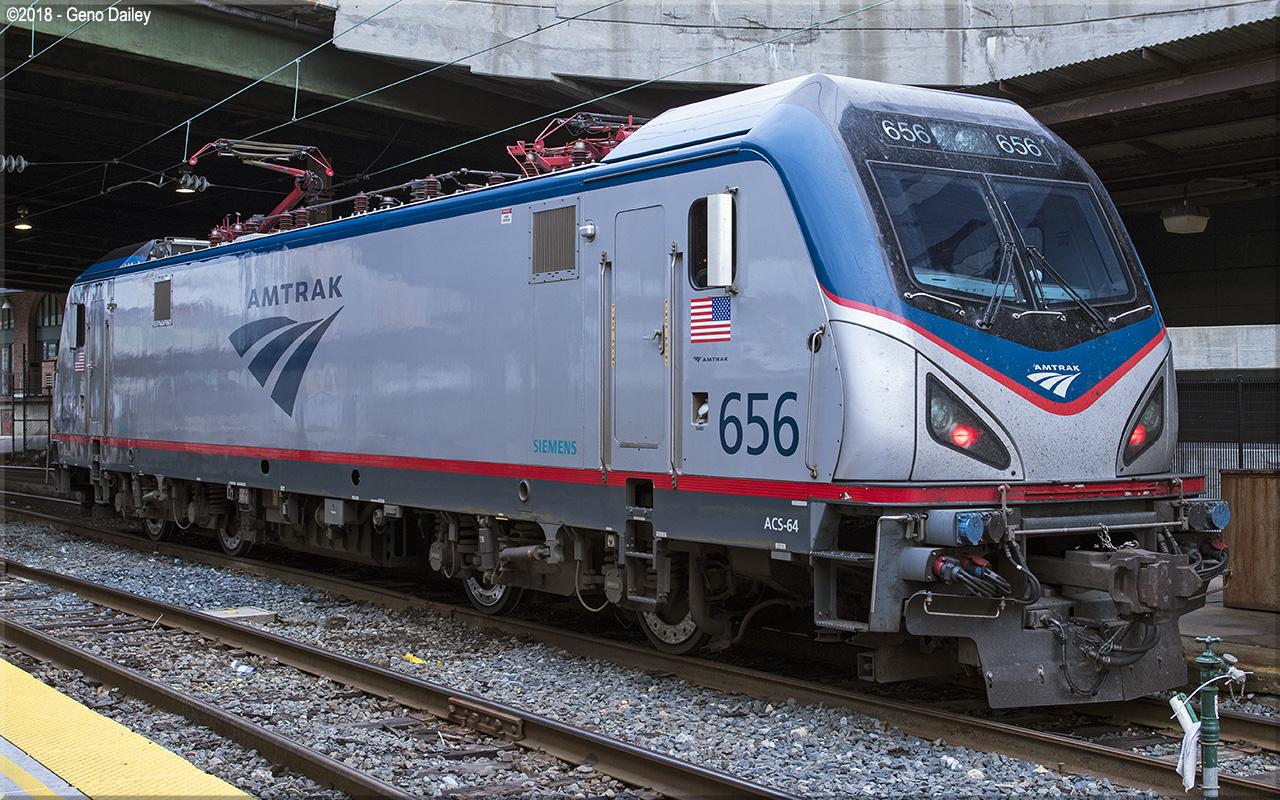 Built by Siemens Mobility in Sacramento, CA in August 2015 and numbered 656, these locomotives are the replacement for Amtrak's AEM-7 electric locomotives for use on the Northeast Corridor. The name "ACS-64" means "Amtrak Cities Sprinter" and the 64 represents 6.4 megawatts of electric power which is equivalent to 8600 horsepower. Historical information about this locomotive provided by www.amtrakbythenumbers.com. |