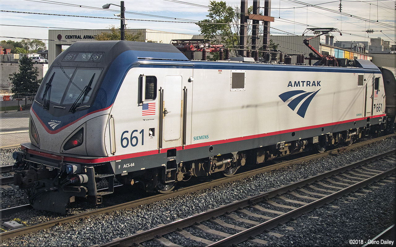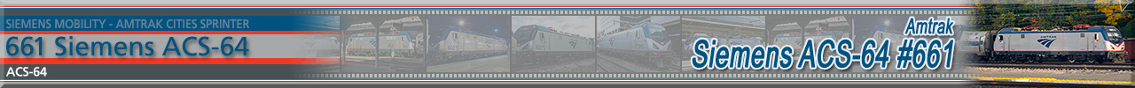 Built by Siemens Mobility in Sacramento, CA in October 2015 and numbered 661, these locomotives are the replacement for Amtrak's AEM-7 electric locomotives for use on the Northeast Corridor. The name "ACS-64" means "Amtrak Cities Sprinter" and the 64 represents 6.4 megawatts of electric power which is equivalent to 8600 horsepower. Historical information about this locomotive provided by www.amtrakbythenumbers.com. |