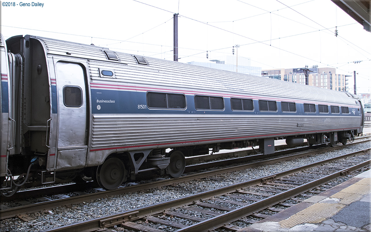 Built as a long-distance coach in October 1976 with 60 seats and 2 dressing rooms and numbered 21851. Trainline-equipped for push-pull operation in December 1988 and renumbered 44851. Refurbished for Metroliner Service in March 1995 and renumbered 44951. Converted to a Capstone Business Class coach in April 1999 and renumbered 81501. Historical information about this car provided by www.amtrakbythenumbers.com. |