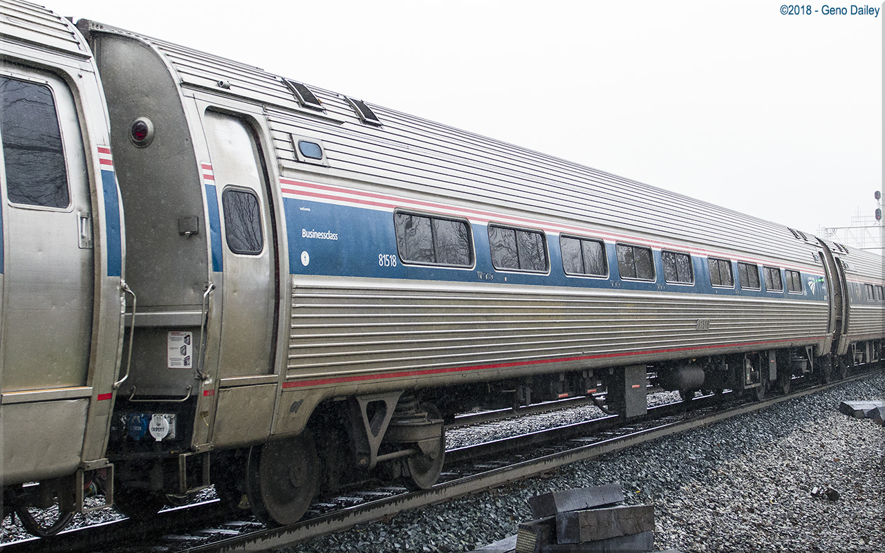 Built as a long-distance coach in September 1976 with 60 seats and 2 dressing rooms and numbered 21823. Trainline-equipped for push-pull operation and refurbished for Metroliner Service in August 1989 and renumbered 44923. Converted to a Capstone Business Class coach in September 2006 and renumbered 81518. Historical information about this car provided by www.amtrakbythenumbers.com. |