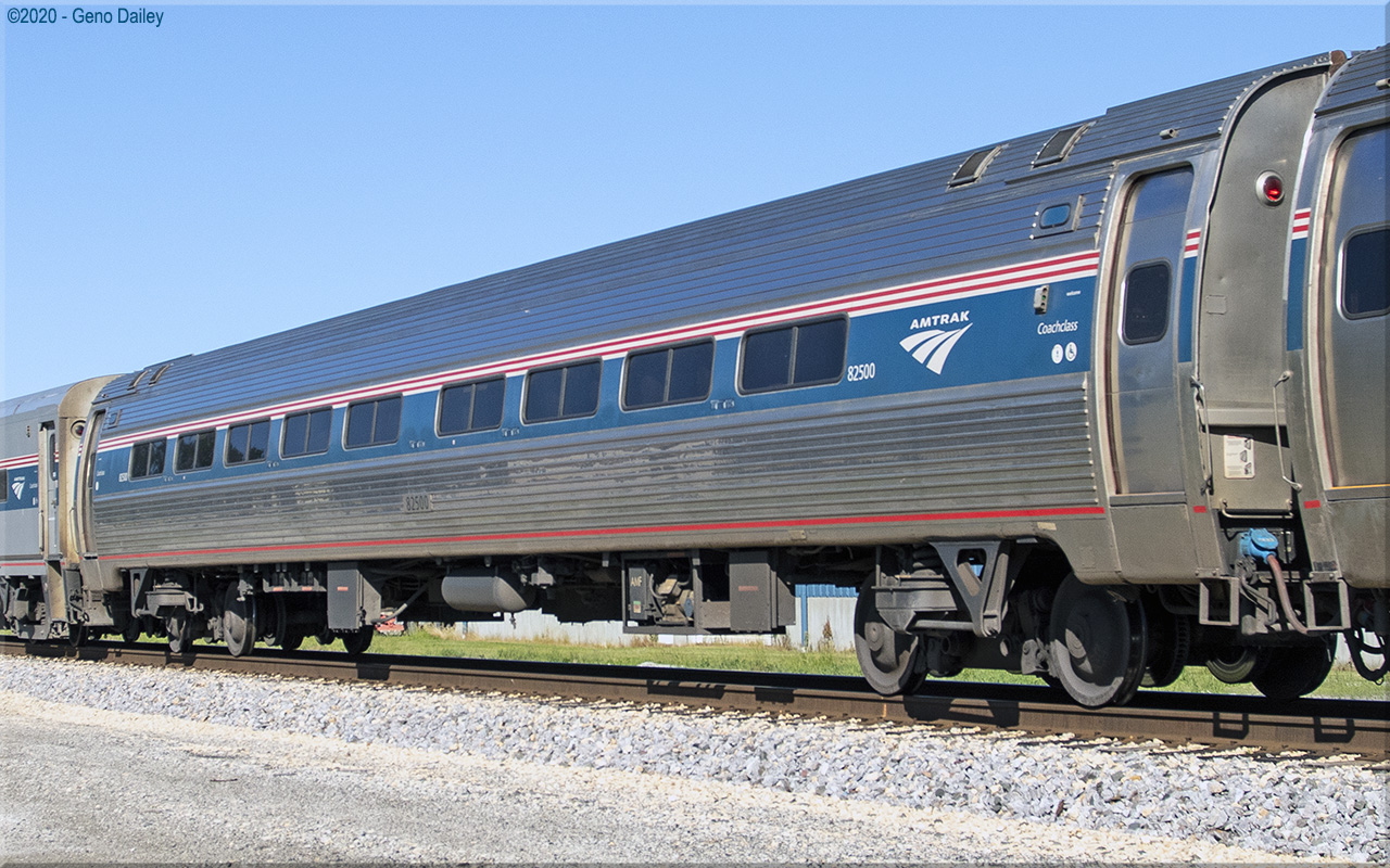 Built as a standard 84 seat coach in June 1976 and numbered 21174. Trainline-equipped for push-pull operation in May 1988 and renumbered 44174. Converted to a Capstone coach with 72 seats in July 1999 and renumbered 82500. Historical information about this car provided by www.amtrakbythenumbers.com. |